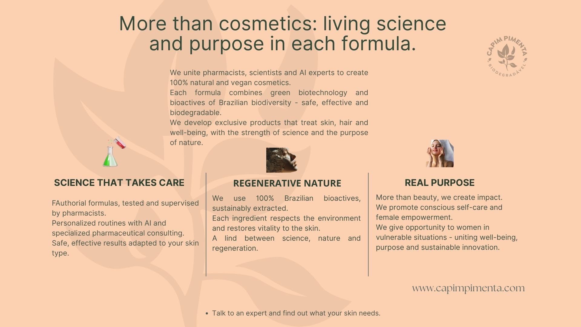 “Capim Pimenta — ciência viva e natureza em equilíbrio para transformar cada cuidado em um ritual de propósito e beleza real.”